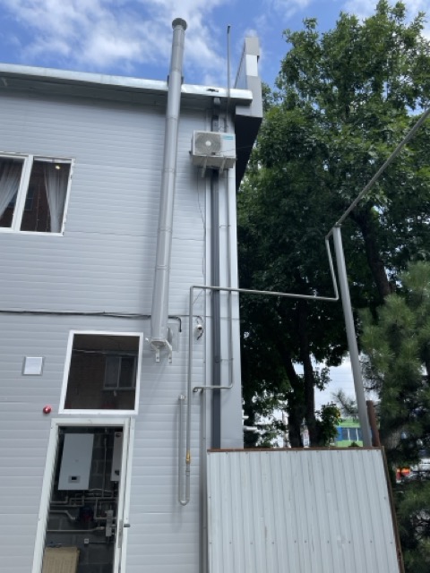 Вытяжная вентиляция закреплена без повреждения фасада. Она обеспечивает необходимую циркуляцию воздуха в котельной